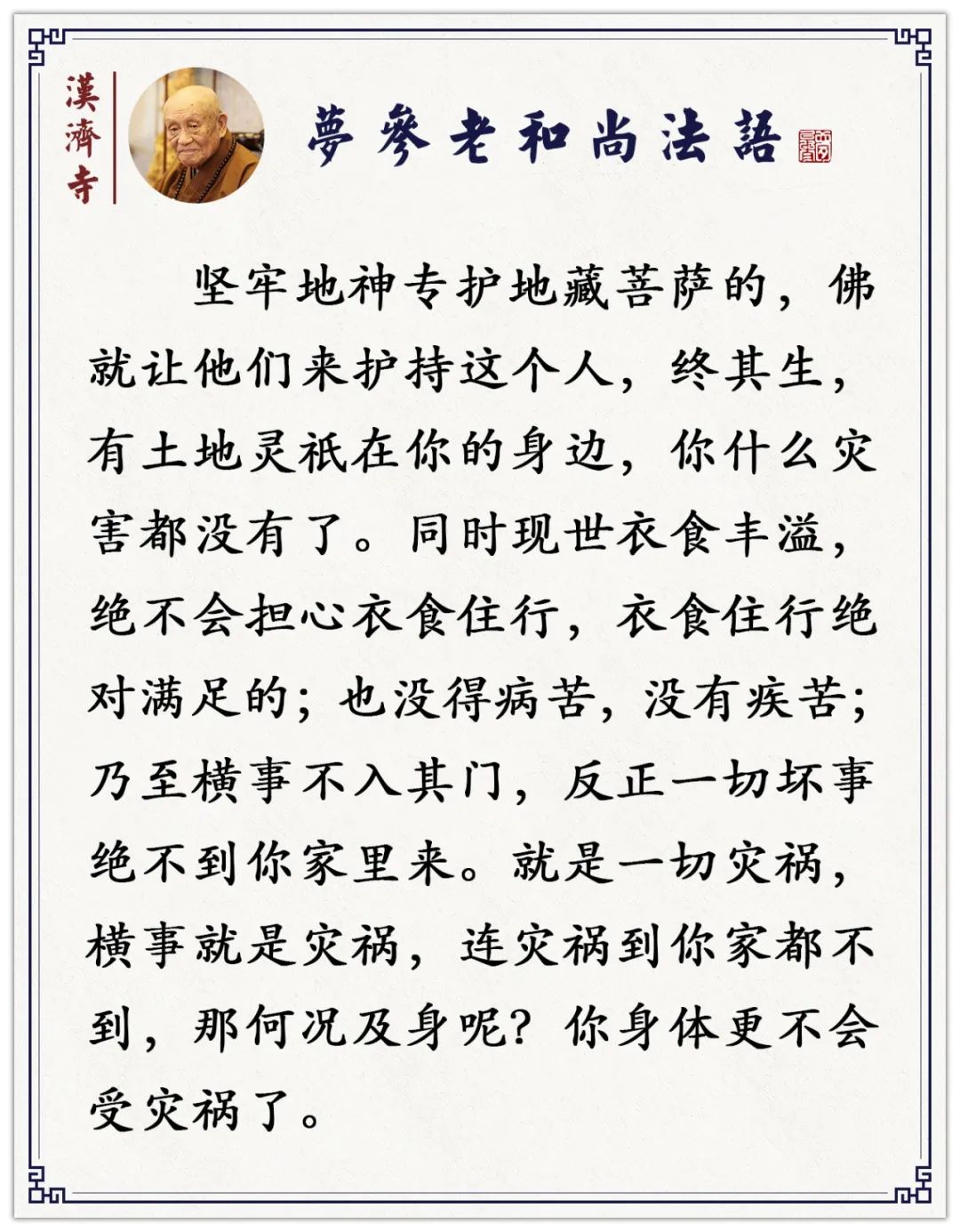 我们把这些做好事、行善业的人,看成诸佛菩萨一样的,叫这些小鬼,这些小鬼有大力量的,乃至土地灵祇,令他们卫护这个行善者,使他没有“恶事横事”。什么叫“横事”?不该发生的发生了,恶病、传染病、或车祸,邻家失火连续到他,他也遭殃了,这都叫横事;“恶病横病”,不该得的得。广说吧,凡是一切不如意的事都不入这个行善者之门,让他们阖家平安。