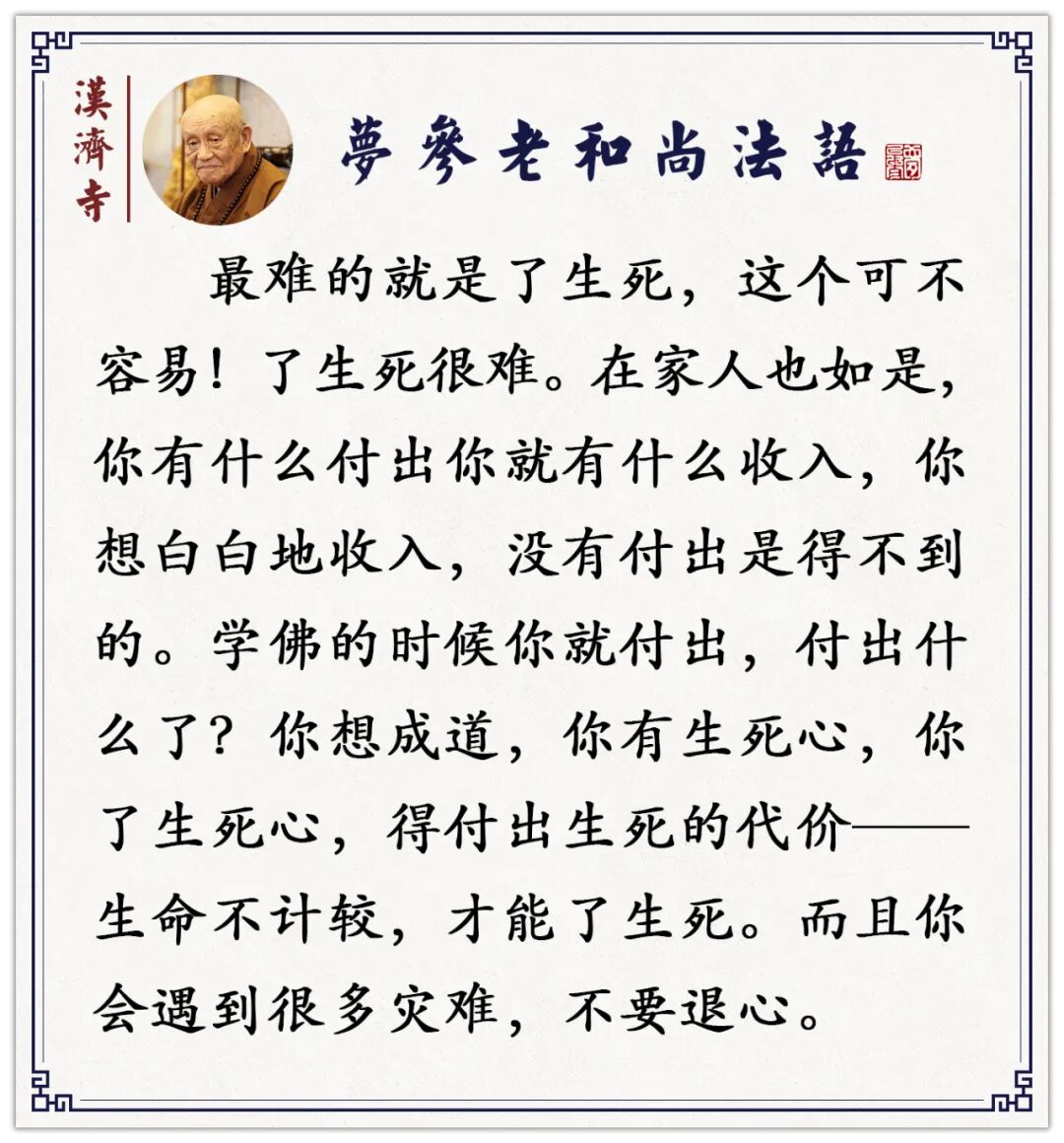 人家住禅堂的,生死心切!懂得“生死心切”吗?连生命都不在乎、都不要,修行就像打仗一样地拼命。不论你念佛也好,参禅也好,这不能当儿戏。敌人是谁啊?就是烦恼,一天烦烦恼恼地,念佛也好、参禅也好,你门也入不了——就像我今年出家七十三年了,门都还没入呢!混了这一生,千万不要把这个看容易了。出家人,放下,非将相所能为——治理朝政,当宰相、院长好当,但当个和尚不好当。你和敌人作战,统千军万马,操必胜之权;但是,当个和尚不好当,因为每位道友,你以必死之心才能换来不生死。生死、涅槃,生死是一边;涅槃是不生死,是一边,你没有生死心,怎能换不生死?我看过的一本《神尼传》,都是比丘尼,大家看看她们怎么付出、怎么求道的?很多道友经常来问我:“我信佛、学佛一、二十年了,我的灾难怎么还是很多,佛菩萨为什么都不加持我?佛菩萨不灵啊!”我问他:“你都是怎么付出的啊?”要先有“感”才能“应”嘛!你感到什么程度,就应到什么程度,你根本感不够就想应吗?烧上几支香,给佛像供上几个水果,再磕上几个头:“佛菩萨,您保佑我公司发财,我给您上供、许愿啊!”那佛像要你的供做什么啊?要你的诚心,一片心诚,诚诚恳恳地。但是那个感,你以为是求观世音菩萨、或者是求地藏菩萨,实际上都不是,而是求你自己,由于你的心转变了——我们参禅明心,就是明这一点,信自己的心。我们过去的祖师,有的呵佛骂祖,他是去掉你的执着!“丹霞劈佛”都知道吧!这是去掉你的执着,你的执着没有了,你看破了、放下了、自在了,就是这样子了。所以大家学佛之后,必须有很大的付出,你要想了生死,得用生死来换取不生死,并不是轻心、慢心地坐上几天,禅就开悟了;念几声佛,就生极乐世界了,有那么容易的事吗?恐怕不可能吧!