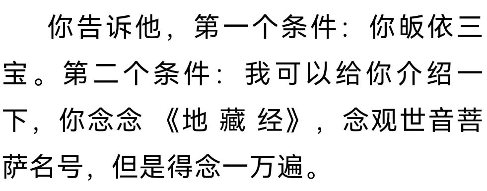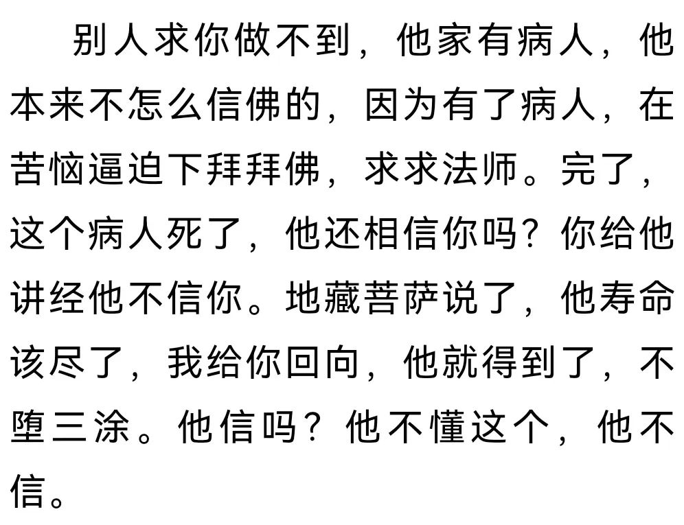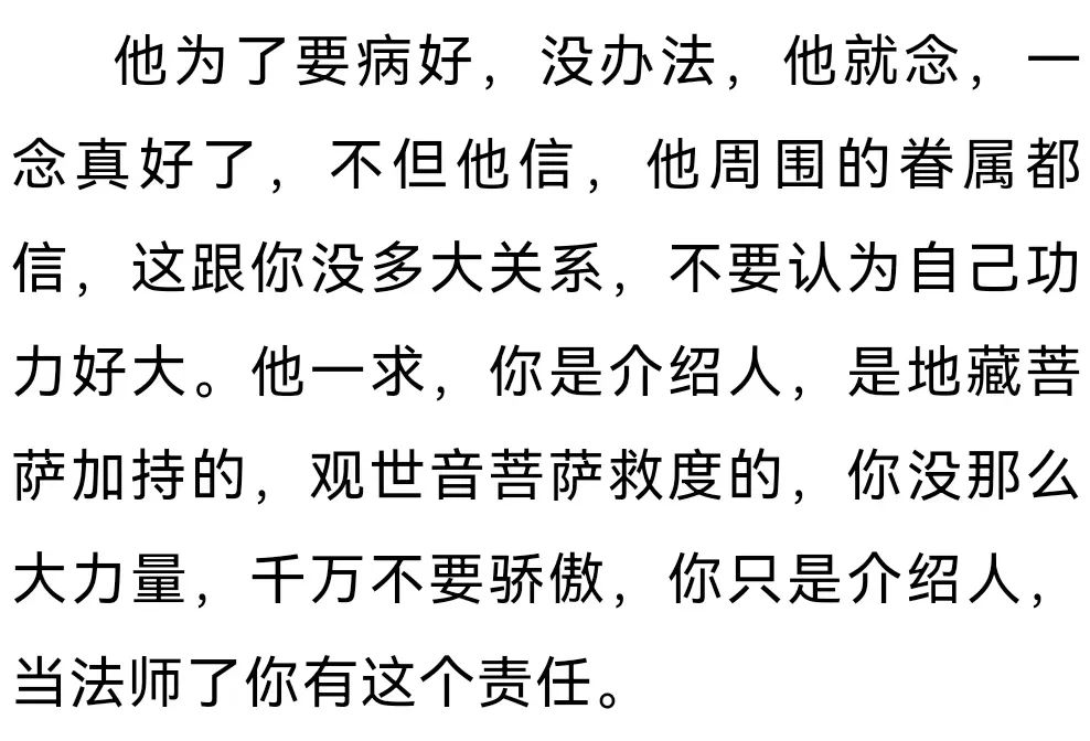 诸位法师,不要把你自己看成了不得,你只是介绍人!谁要求你了,先给他说,“我没这个力量,转化不了你的妈妈,或者你的痛 苦,转不了你这个业,但是我可以给你就介绍一下地藏菩萨、观世音菩萨,他们有这力量。”