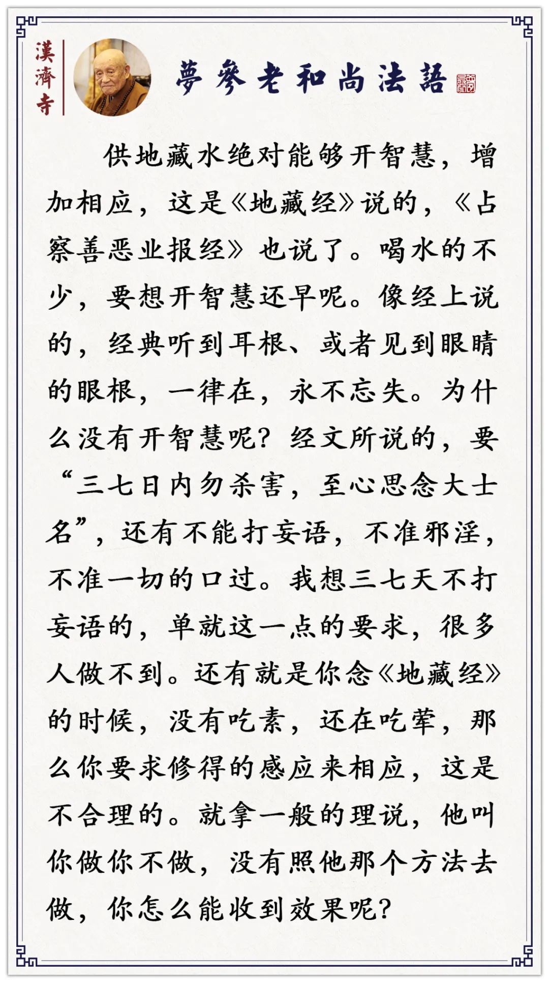 你喝地藏水的时候要非常慎重,喝了之后,如果你在睡梦中见地藏菩萨现无边身,给你授灌顶水。哎!那你就明白、聪明了,所有的经典,一历耳根,即当永记,更不忘失一句一偈。