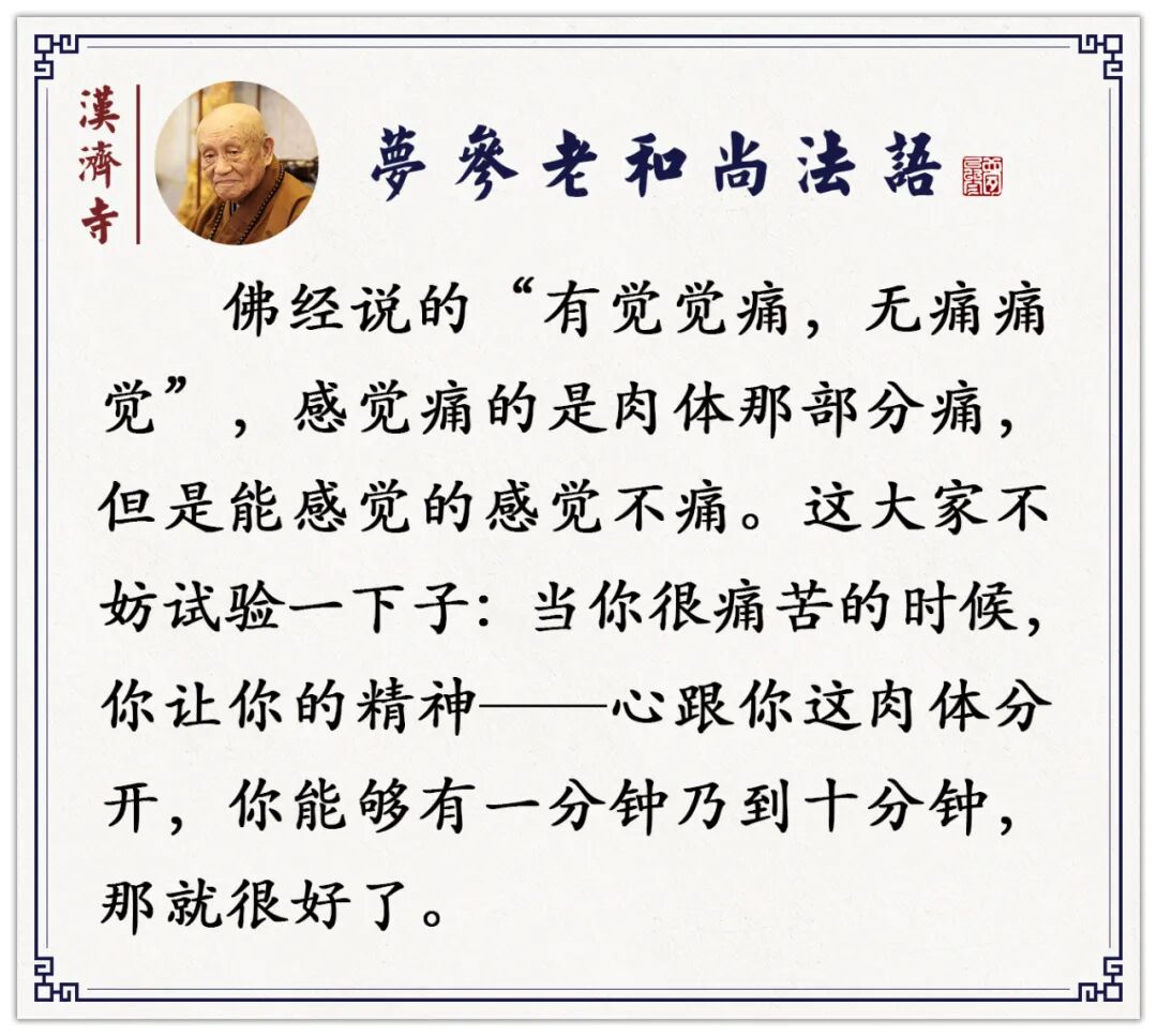 为什么突然间一明白就不痛了呢?如果我们诸位道友害病也好,或者受到伤害感觉到痛,你观一下吧,谁在痛啊?在这个时间你把你的心——能觉悟的这个觉性,跟你这个肉体的体分开,这就是经上所说的“有觉觉痛,无痛痛觉”。你有个感觉觉得痛,这个痛啊绝对痛不到你的感觉。所以不能开悟啊,开悟则当下痛苦减轻。