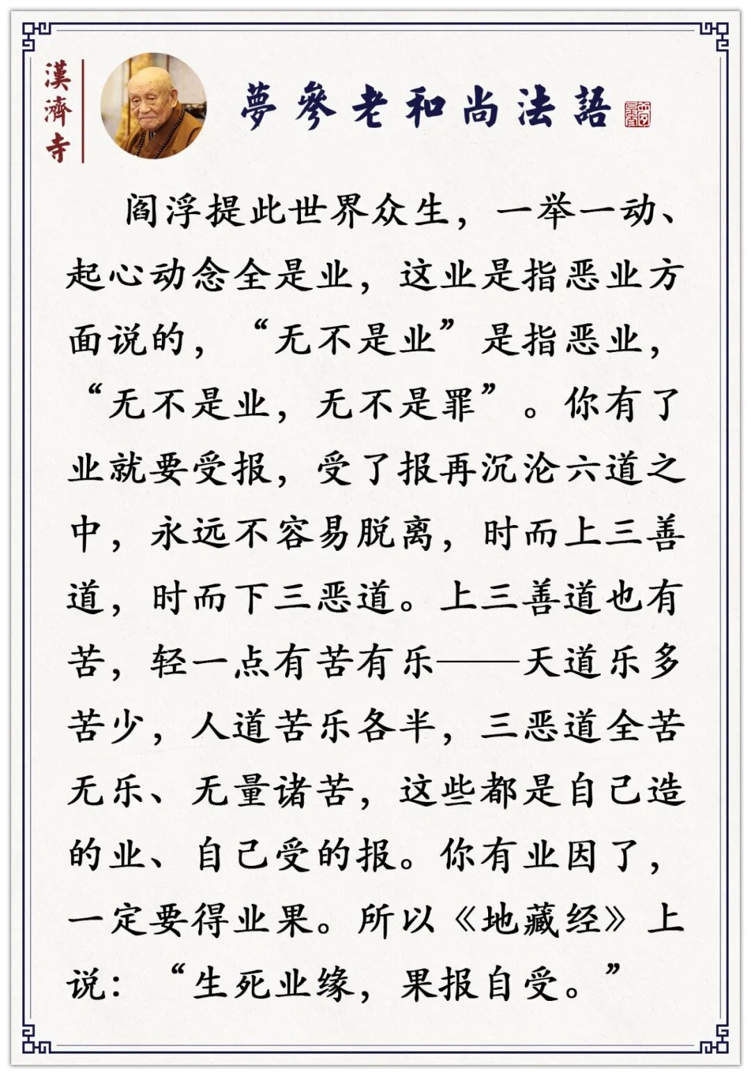 阎浮提此世界众生,一举一动、起心动念,全是业。这业是指恶业方面说的,“无不是业”是指恶业,无不是业,无不是罪。你有了业就要受报,受了报,在沉沦六道之中,永远不容易脱离,时而上三善道,时而下三恶道。