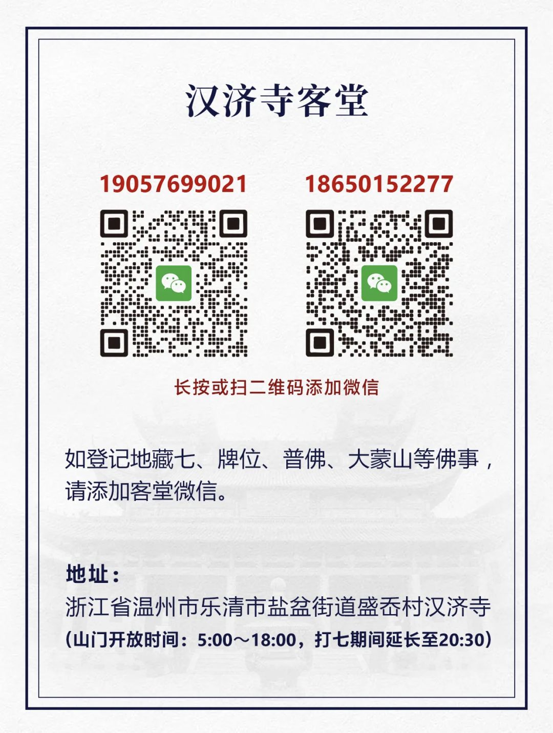 2026年3月26日,农历丙午年二月初八,这是一个在佛教历史上意义非凡的日子——释迦牟尼佛出家纪念日。 两千五百多年前的这一天,古印度迦毗罗卫国的太子悉达多,毅然舍弃世人艳羡的尊贵王位、美满家庭与奢华生活,于夜深人静时离宫出家,踏上了寻求生命终极真理的道路。 这位“人生赢家”的抉择,源于四次出游所见:东门颤巍巍的老者、南门痛苦呻吟的患者、西门令人悲伤的死者,以及北门那位安详庄严的沙门。 生、老、病、死的残酷现实,撞击着太子敏锐而仁慈的心。为寻求解脱此等大苦的方法,他选择了一条最孤寂也最光辉的道路——出家,踏上了舍弃小我、追求觉悟的伟大旅途。 在这样意义殊胜的日子里,乐清盛岙的唐末古刹——汉济寺,正式启建丙午年地藏七“拜《占察忏》”共修法会。法会为期十四日,自农历二月初八至二月二十一。 打七前日,寺内已举行洒净仪式,杨枝净水遍洒道场。随后大众齐集大斋堂,学习共住规约,收摄身心,以迎接接下来的精进共修。 首日行忏 清晨,寺内板声清越,划破山间的寂静。 早课过后,上午时分,法会核心内容——拜《占察忏》正式起香。钟磬齐鸣,梵呗悠扬,在维那师的带领下,与会大众整肃威仪,至诚礼拜。 《占察忏》源于《占察善恶业报经》,是释迦如来格外慈悲、地藏菩萨称机发愿所宣说的殊胜忏悔法门。此法事仪与理观并重,尤为契合末法时代众生根机。 在佛陀出家日——纪念佛陀为求解脱、为利众生而舍俗修行的日子里,汉济寺四众弟子以拜忏为行持,正是对佛陀出家本怀的缅怀与实践——以忏悔净除自身业障,以修行迈向觉悟之路,自觉而后觉他。 忏法利益 为何要修持《占察忏》? 净宗九祖、明代四大高僧之一、自称“地藏之孤臣”的蕅益大师在其著述的《占察善恶业报经行法》中,这样论述: 若佛弟子,欲修出世正法者,欲现在无诸障缘者,欲除灭五逆十恶无间重业者,欲求资生众具皆得充饶者,欲令重难轻遮皆得消灭者,欲得优婆塞、沙弥、比丘清净律仪者,欲得菩萨三聚净戒者,欲获诸禅三昧者,欲获无相智慧者,欲求现证三乘果位者,欲随意往生净佛国土者,欲悟无生法忍圆满证入一实境界者,皆应受持修习此忏悔法。 大师继而指出其所以然: 何以故?此是释迦如来格外弘慈,地藏菩萨称机悲愿,无苦不拔,无乐不与。依此修行,净信坚固,如经广明,所宜谛信。 可见,此法门乃对治末法众生深重业障的特效法药,无论是求解脱、除障缘、灭重罪,还是求福报、得戒体、开智慧,乃至成就禅定、往生净土、悟入实相,皆可依此忏法用功。 蕅益大师自身便是此法门的践行与得益者,他在《行法》缘起中自述:“予悲障深,丁兹法乱,律教禅宗,淆讹匪一。幸逢斯典,开我迷云,理观事仪,昭然可践。”其推崇与感恩之情,溢于言表。