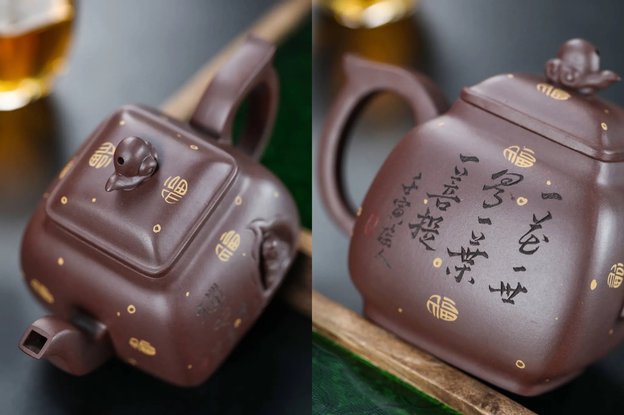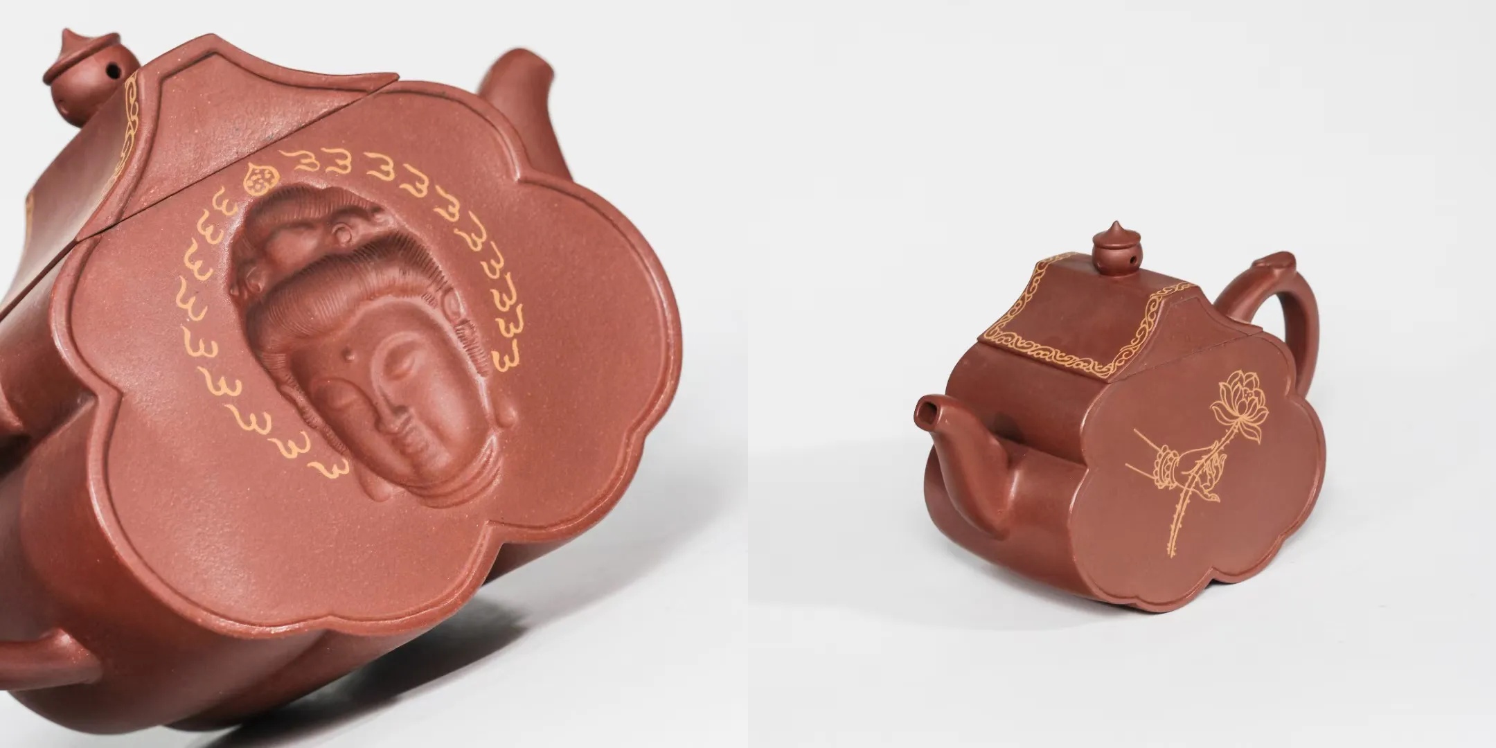 其中《禅意四方佛韵壶》壶身方正稳重,正面浮雕庄严佛像,周遭祥云缭绕。高贵云老师阐释其寓意:“心中有佛,茶禅一味”。