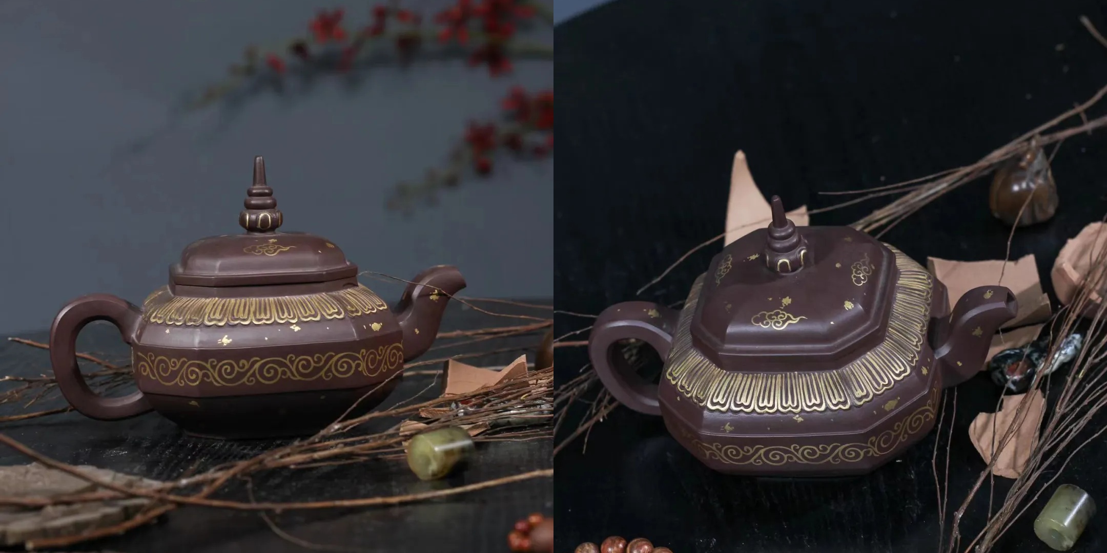 《天竺梵华》此壶的妙处,在于以紫砂为纸,化禅意为画。壶身之上,莲瓣与卷草描金环绕,如佛光隐隐流转,光华内敛而庄严自生。塔钮高立,似接云汉,静置案头,便是一隅清净禅境,正所谓“一壶载禅韵,心静茶自清”。