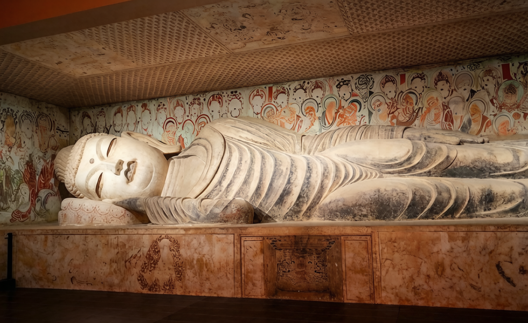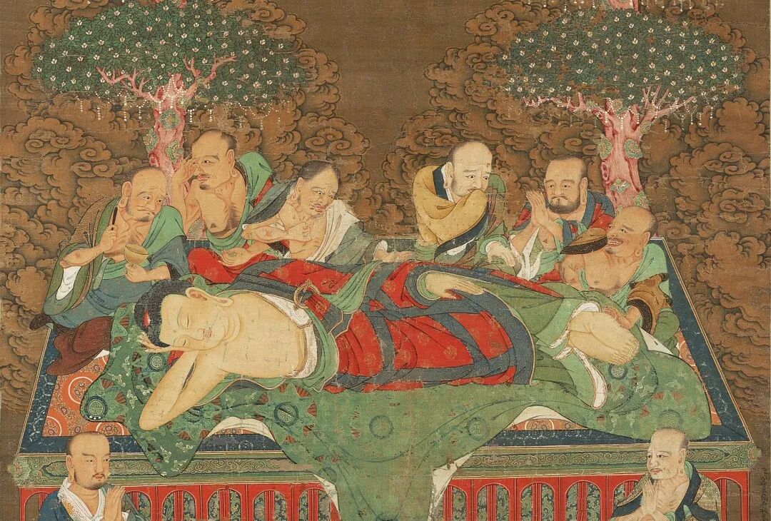 在最后的时刻,佛陀头北面西,右胁而卧,此即著名的“吉祥卧”。他对围绕身旁的弟子们作了最后的教诲与咐嘱,而后平静入灭。