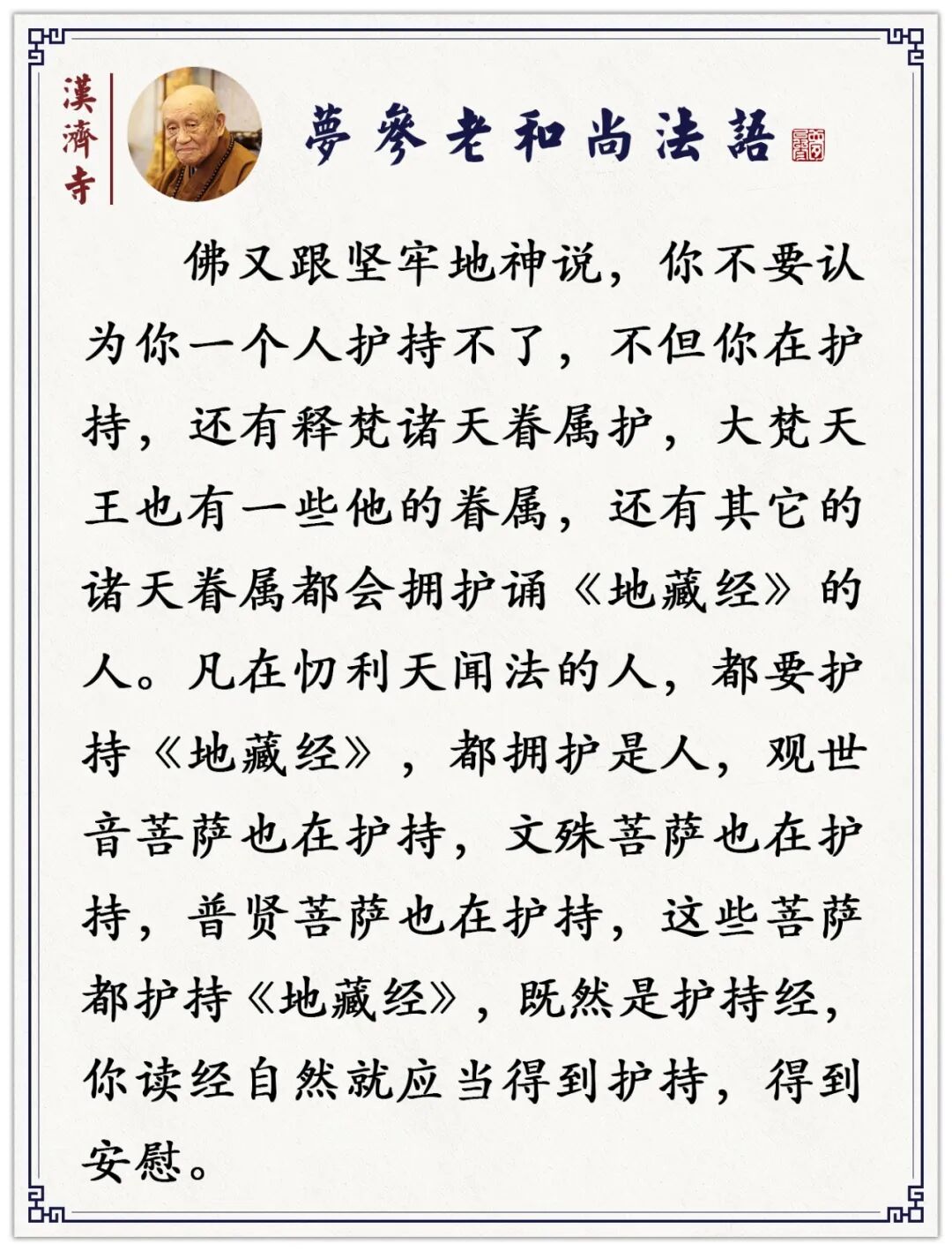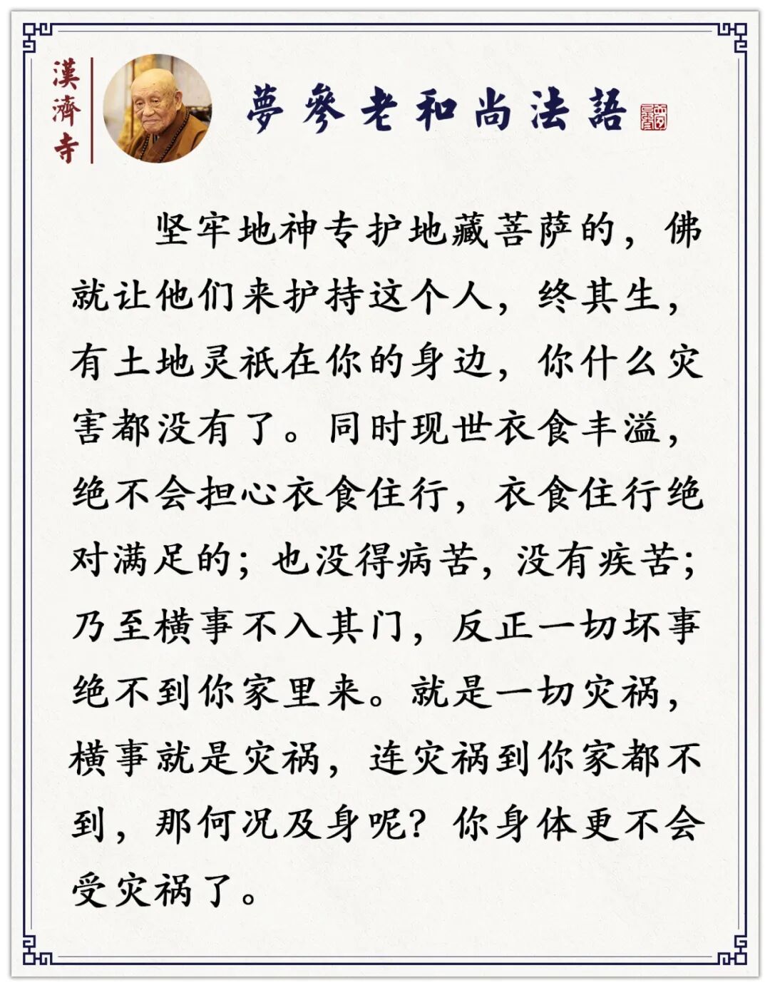 【复白佛言。世尊。未来世中。若有善男子善女人。于所住处。有此经典及菩萨像。是人更能转读经典。供养菩萨。我常日夜以本神力。卫护是人。乃至水火盗贼。大横小横。一切恶事。悉皆消灭。】“复白佛言:世尊,未来世中,若有善男子善女人,于所住处……”不论他住在什么地方都可以,但是他家里头要有此经典,有《地藏经》,或者供的有菩萨像──地藏菩萨像,这个功德就很大了,就得到平安了。假使这个人还能读《地藏经》,就是“转读经典”,对着地藏像要烧香,经常供养,“我常日夜以本神力”守护他。坚牢地神说若有人供养地藏像的,或者有《地藏经》所在的处所,我以我的神力,我来护持这个人,我令这个人的家庭眷属没有“水火盗贼、大横小横,一切恶事悉皆消灭”。“大横小横”就是不正常的死亡,像出车祸,游泳淹死了,或者上山,像经常爬珠穆朗玛峰的那些个死在山上,这都叫“横死”,就是不应当死而死的叫“大横小横”。佛在《药师经》里面说有九种横死。一个,得病虽轻,但没有医药及看病者,或者医生给错药了,不应该死,但死了;王法诛戮,是不正常的、是冤枉死的,没法伸冤;或者让鬼神把他精气给他夺了,就是鬼迷心窍,那是一种──鬼夺人的精气的,那得有因缘,不是人人都被他夺的;或者火焚,遭受火灾;或者水淹,掉到水里去;或者是被恶兽把他吃掉,到山林里头恶兽把他吃掉;或者在山路上走,堕到山崖底下的;或者被毒药毒死的;或者被那个邪的──或者是人或者是鬼神,用咒术把他咒死的;或者因为吃不饱饭,或者因为渴没有水喝,饥渴困死的。这九种都叫“横死”,是不该命尽,遇到这种劫了死掉,这是《药师经》讲的九种横死。为什么有这些现象?阎浮提这些个现象多得很。例如说过去骑马,摔死了。我曾在部队看到一个现象──他骑着马,他穿一双靴子,靴子那后头带着刺马针。那个刺马针把那个马扎到了,那马就疯了一样地撞,他怎么也勒不住,那个马就撞到影壁墙上,连马带人都摔死了。我亲自看见的──他不注意。大家看到过去穿那个靴子,后头带刺马针,刺马针有个袢子挂上。还有吃饮食,好吃的吃过了量了,撑死了。像我们在西藏常遇到,因为大家不懂得到西藏去,他那是拿那牛肉做的,跟糌耙和起的,那东西你只能吃少一点点,吃完了非常渴。一喝水──我们汉人不懂得,还想拿这东西吃饱,那可就麻烦了。不能吃饱,吃个三分饱就可以了。你想,一个牛把它晾干、抹成粉子,跟糌耙一样,跟糌耙和一起,当你吃了很干渴,你再一喝水,它到胃里头发了,一倍发十倍。我们很多到西藏的撑死了,他喝那酥油茶,不会喝的。喝茶喝死了,吃饭吃死了,听说过吗?这个事都有的。饿了很久,突然得到饮食,猛吃,那可不行。好几天没吃饭的人,你只能喝稀的,慢慢使你润胃。就吃饭的不应该吃,撑死的,这也有,就是不量食。还有吃的饮食,不习惯的饮食,以前的饮食没消化,又吃。“不饭食、不量食、不习食、不出食”,就光吃饭冤枉死的很多,这都叫横死,这类很多了。或者大小便憋死的,或泻肚泻死的,这都寿命没尽。病治不好。遇见奔牛奔马,现在很多运动当中不该死的死了。这是死于非命。【佛告坚牢地神。汝大神力。诸神少及。何以故。阎浮土地。悉蒙汝护。乃至草木沙石。稻麻竹苇。谷米宝贝。从地而有。皆因汝力。又常称扬地藏菩萨利益之事。汝之功德。及以神通。百千倍于常分地神。若未来世中。有善男子善女人。供养菩萨。及转读是经。但依地藏本愿经一事修行者。汝以本神力而拥护之。勿令一切灾害及不如意事。辄闻于耳。何况令受。非但汝独护是人故。亦有释梵眷属。诸天眷属。拥护是人。何故得如是圣贤拥护。皆由瞻礼地藏形像。及转读是本愿经故。自然毕竟出离苦海。证涅槃乐。以是之故。得大拥护。】“佛告坚牢地神,汝大神力,诸神少及。”佛说你的神力一般的神比不上你,为什么?“阎浮土地,悉蒙汝护”,这个世界土地全仗着你了。“乃至草木沙石,稻麻竹苇,谷米宝贝”,都是从地而有。从地而有的,就是仗着你的力量了。你现在又“称扬地藏菩萨利益”,又护持地藏菩萨,那其他的神都赶不上你。若是未来世的善男子、善女人,凡是供养地藏菩萨,或者转读《地藏经》的,或者是他只依《地藏经》“一事修行者”──其他的佛法都不懂,也不学了,就依《地藏经》一个事情、照着《地藏经》去做──那你就以你的力量、神力来护持他,不让他发生不如意的事情──让他听都听不到,何况他受?就是保护一切众生。“非但汝独护是人故”,佛又跟坚牢地神说:你发愿是这样子,但是读《地藏经》的不是你一个人护持,多了!“释梵眷属”,帝释天、十八梵天都护持这个人,就是一切天人拥护。“何故得如是圣贤拥护?”为什么能感得一切拥护诵《地藏经》的或者供地藏像的呢?就是因为他瞻礼供养地藏像,或者念《地藏经》。假使要能读《地藏菩萨本愿经》,能出离苦海。“自然”出离苦海,读《地藏经》自然就能出离苦海,“证涅槃乐”。就是以读《地藏经》的因缘,能够得大拥护,这是佛赞叹,读《地藏经》就能离苦得乐。