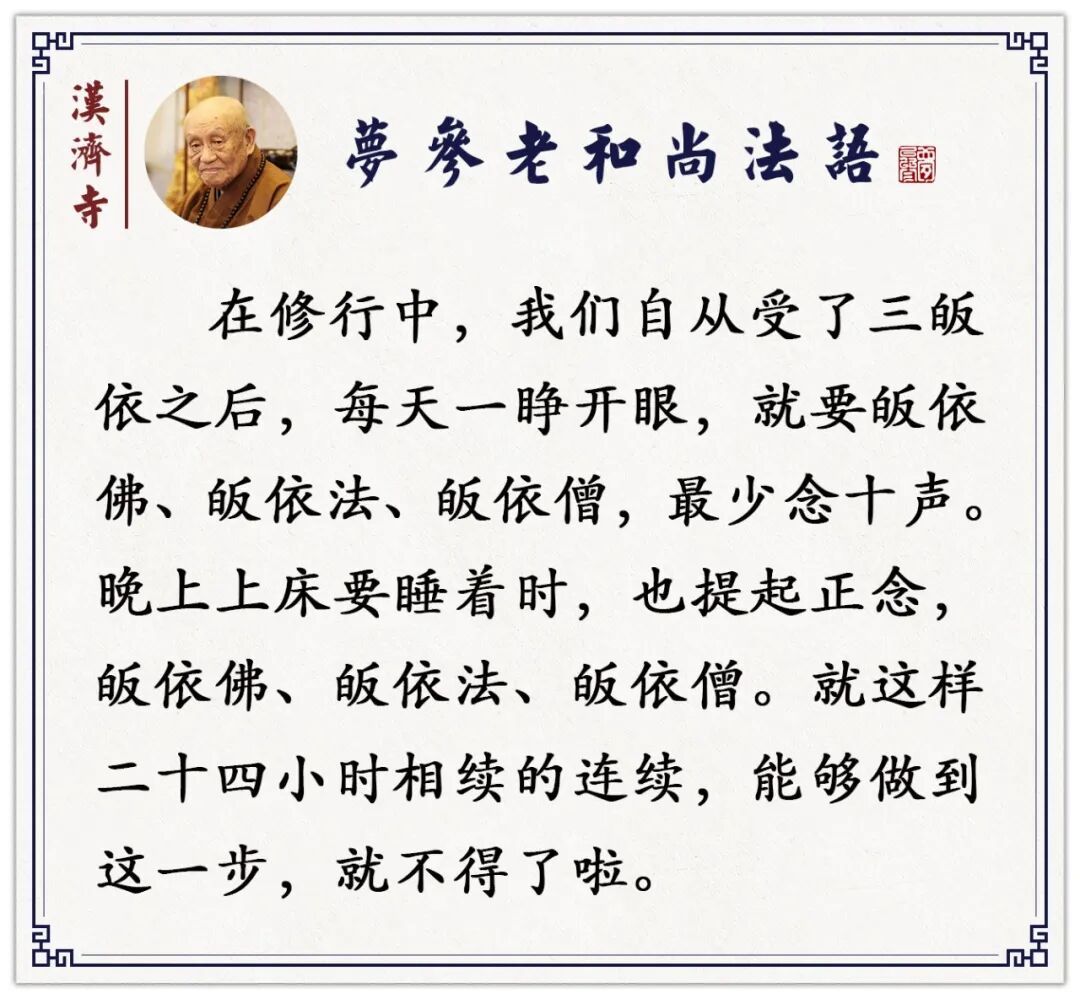 你白天一起来,在家俗务很多,你恐怕会忘记念。如果早些时候把它念好,存到那里头,白天没念,我早上已经念了;晚上一睡觉,这一天事情都过了,到晚了,夜间怕做梦啊,做梦的时候也不忘三宝,念“皈依佛、皈依法、皈依僧”。