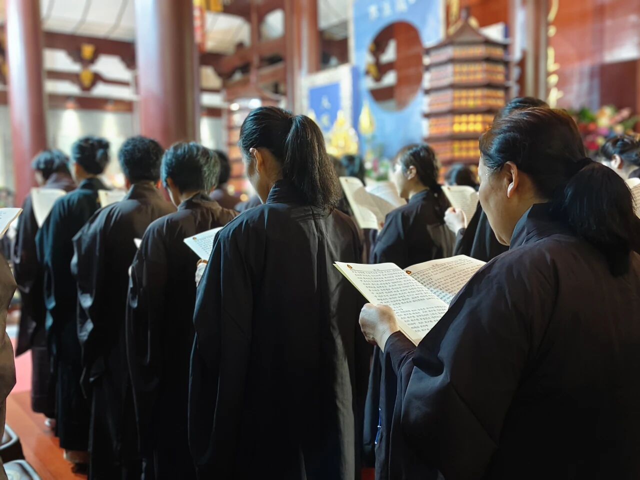 四众弟子以虔诚之心感恩祖国的繁荣昌盛,感恩强大的祖国为修行人撑起万里晴空,令修行人能安稳办道。