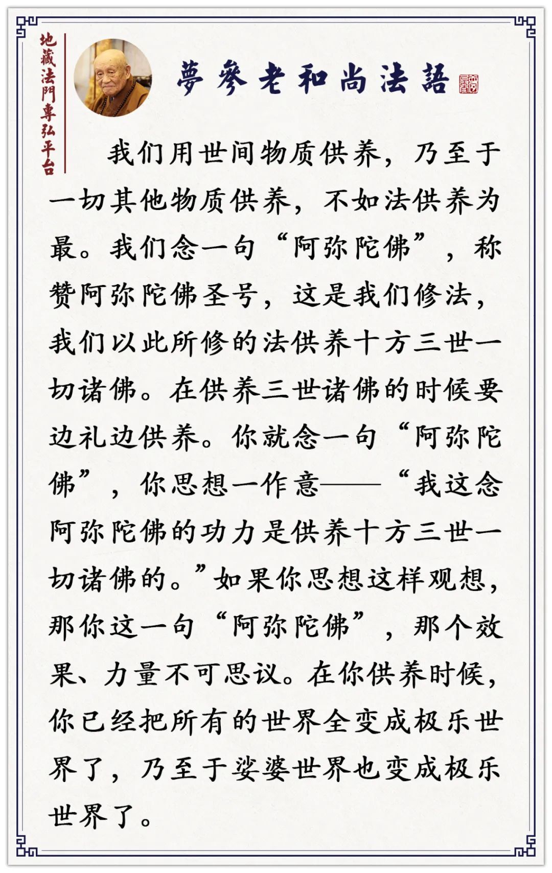 你说:“我没看见。”没看见,没关系,你用意念观想:“我和你们有缘,我天天供养你们,令你们离苦得乐。”这叫法供养。假使你能天天持续意念供养心,这叫布施。