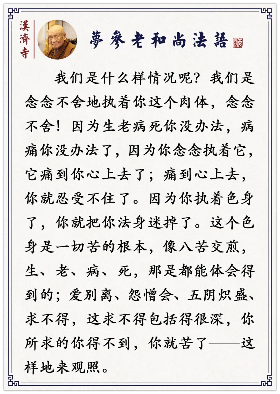 我们是念念不舍地执着你这个肉体,念念不舍!因为生、老、病、死你没办法了,病痛你没办法了,因为你念念执着它,它痛到你心上去了;痛到心上去,你就忍受不住了。因为你执着色身了,就把你法身迷掉了。这个色身是一切苦的根本,像八苦交煎,生、老、病、死,那是都能体会得到的;爱别离、怨憎会、五阴炽盛、求不得,这求不得包括得很深,你所求的得不到,你就苦了——这样地来观照。我们现在是执着色身,迷了法身,所以一切苦你不能够脱离。怎么不能脱离呢?心脱离不了。我们经常爱说的两句话——有觉,有知觉觉到了痛苦,没有个痛苦能痛到你的知觉上去,叫“有觉觉痛,无痛痛觉”。如果你觉变了,就是你觉悟那个觉变了,法身大士他变了,他是法身,那你在肉体所受的一切苦、八苦交煎都没关系了。在这个时候,你经常这样修观吧!我们跟诸佛菩萨差得不很大,就是这一点点,这一点点就通不过。通过这一点点,你就是菩萨、就是佛了。因为他舍了这个假色身,他证得真的法身。看着他的色身跟我们色身是一样的,都是肉体的,但是不同了——他心是真心,身是法身,这就是悟得了他的本体了,就是咱们前头所说那个本觉——无始的本体。但是法身大士有分别的,十种,乃至二地到九地、初地跟十地不同的,跟初地、十地不同的。那就是法身菩萨他觉察到念住,念没有住相,就是无住。《金刚经》说“无住生心”,无住生心所生的心不住色生,不住声、香、味、触、法生,就是不住六尘境界生心。心还有生吗?无生。这个住念呢,念也是无念。十法界的依正二报、生死涅槃,包括世出、世间法,都是幻有的,都是不实。如果把这个幻有的当成实有的,就不能圆融,这就叫法执,执着法。这个法身大士他登了地了之后,他证得了真空理了,他知道一切法都是空的。但是他没到彻底,从二地到九地,他是渐渐执渐渐破、渐渐执渐渐破,初地不知二地事,二地不知三地事……他就不能够知道上位的事情。这是就那个色心之法来分别的,从法执来分别的。
