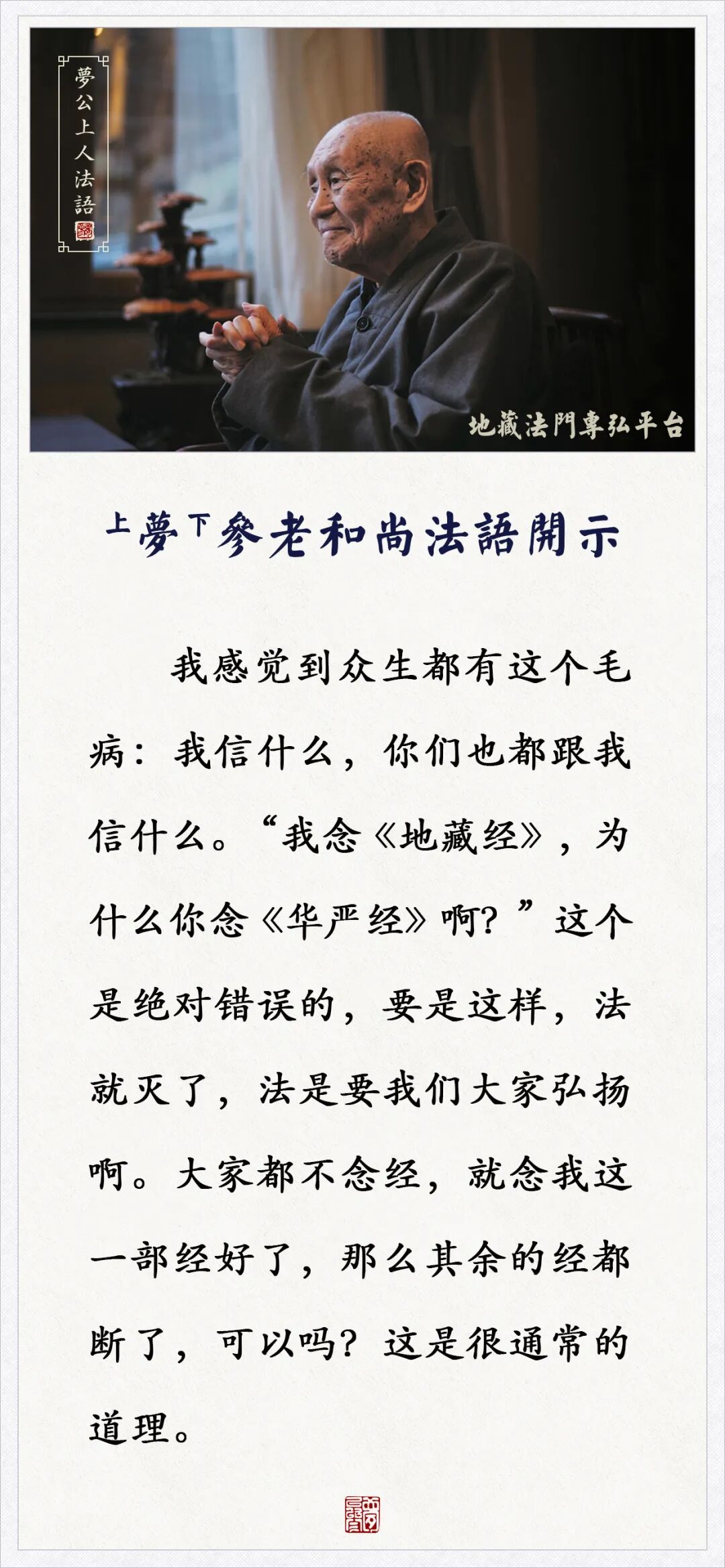 我感觉到众生都有这个毛病——我信什么,你们也都跟我信什么。“我念《地藏经》,为什你念《华严经》啊?”这个是绝对错误的,要是这样,法就灭了。法是要我们大家弘扬啊。大家都不念经,就念我这一部经好了,那么其余的经都断了,可以吗?这是很通常的道理。