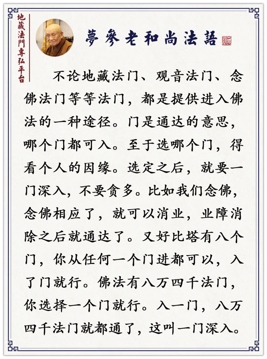 所以说,现在末法时代的善知识,不能知道你前世的情况,你需要根据个人情况,自己摸索,然后一门深入。否则,就只是种善根而已。