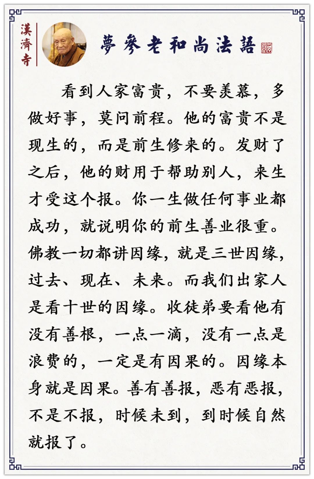有的做贸易一做就发财,有的一做就赔。为什么?这就是我们佛教讲的,过去的福报、过去的因。佛教是讲相续不断的,你今生所受的是前生所做的;你要问你未来如何,你今生做的,未来要受。