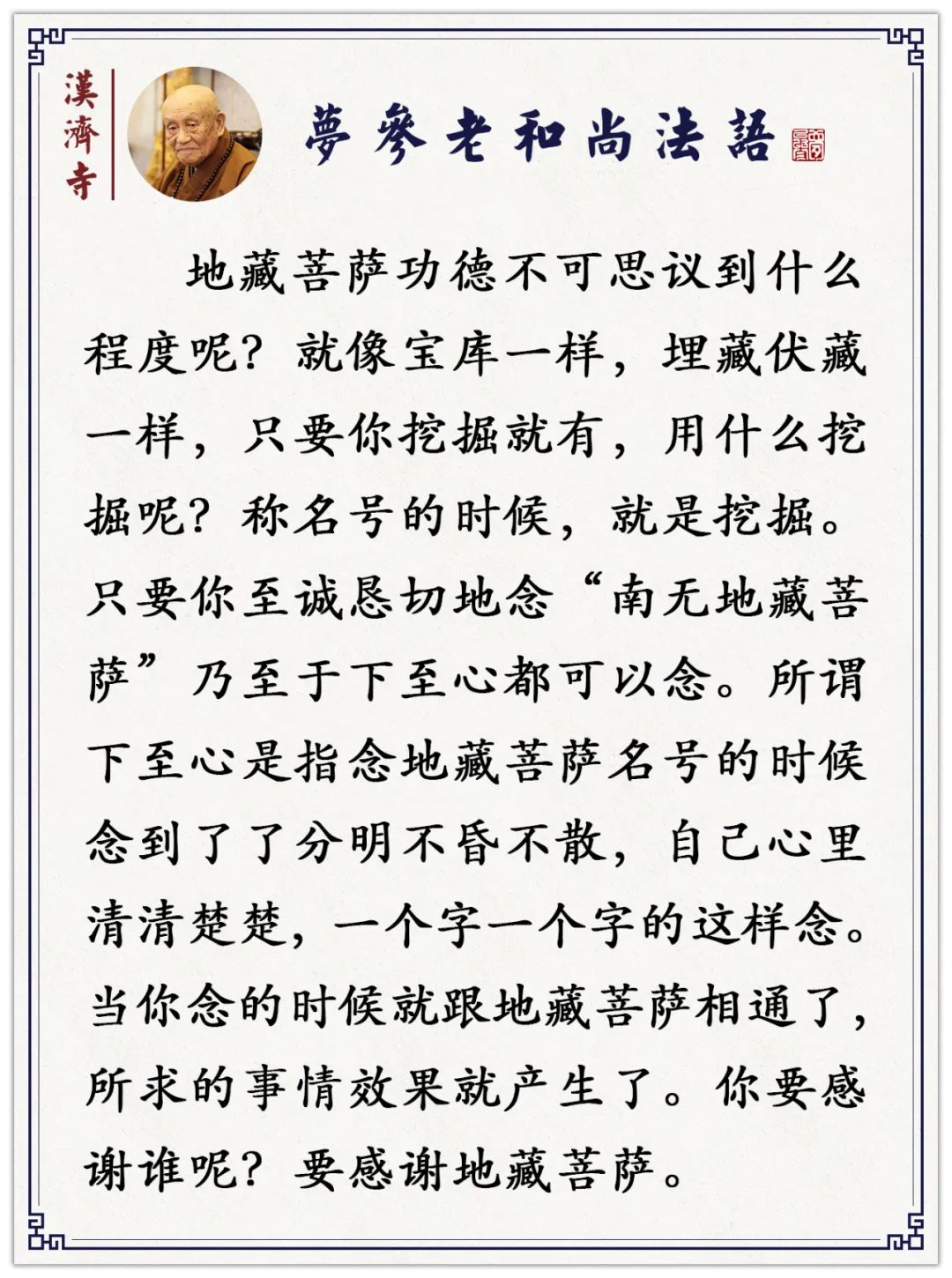 这个人若能见到地藏菩萨形像、或者塑地藏菩萨形像,乃至闻到地藏菩萨名号,“一瞻一礼”,只礼一拜,“一至七日”,一天到七天,至诚恳切地——就是最初发心的时候,一直到七天还不退初心,还是最初发心那个愿望。如果是闻地藏菩萨名、或者见到地藏菩萨所塑的像,瞻礼供养,求什么呢?就求见自己的亡人。那这个人眷属“假因业故”,他的眷属各有各的业——业是堕到恶趣当中去了,那时间有很长的,“计当劫数”,但是得到他弟兄姊妹给他这样地供养地藏菩萨形像,“瞻礼功德”,他就能得到解脱。如果咱们对于自己过去的父母、弟兄姊妹,或者六亲眷属,或者朋友,或者别人请求咱们代给他回向,你至诚恳切地给他做,使那个受回向者能够离苦得乐。离开苦了,不受苦难了,会得到幸福了。离开苦难得到幸福,假你给他礼拜、回向功德。最好是念《地藏经》,或者念地藏圣号。因为假你给他回向,做这个功德之后,他就生人天中去了——或者生在人中、或者生在天中,再不受苦难了。生到人天中,一定生活很幸福的。如果你给回向的人,他的本身就有福德、有力量,已经生到人天中了,那你这一念、一回向,增加他的力量、增加他的功德,使他更增胜了,能够增长圣因,“受无量乐”。【是人更能三七日中。一心瞻礼地藏形像。念其名字。满于万遍。当得菩萨现无边身。具告是人眷属生界。或于梦中菩萨现大神力。亲领是人。于诸世界。见诸眷属。】“是人更能三七日中,一心瞻礼地藏形像,念其名字,满于万遍,当得菩萨现无边身,具告是人眷属生界。”就是求六亲眷属这个,前头是说他一礼一拜,假使说他经过三七二十一天,至诚恳切地念地藏菩萨圣号、瞻礼地藏菩萨形像——念圣号一定要满一万声,一万声为标准。但是这个看你的功力如何。你想求一件事,或者发了一个愿,想满你这个愿,你念一万声地藏圣号,你自己感觉到有把握没有?自己也能知道。心里很欢喜,心里很满足了,没有恐怖感了,那你这一万声就灵了。你想赴一个地方,那地方很危险;或者你去不了,路途障碍很多,那你念一万声。效果不够,那你就加十倍——一万声不行,念十万声。一万声大概一天就行了,十万声一天不行了,或者打一个七,或者怎么样。如果十万声还不行——这得自己有把握,你自己求完了,你自己心里头有把握,能知道力量够不够。你感觉着十万声力量还不够,再加十倍,念一百万声。你这个念下来,我想再业障重的,也能自己就安了,感觉着没问题了。但是这个你起码得一个月,一百万声,你一天念三万声,十天才三十万声,你得一个月。这得你自己看你自己的功力。或者见相,见到地藏菩萨相好,梦中见相,地藏菩萨警示你了,那你就有力量了。或于梦中地藏菩萨来了,现大神力。或者你求,我要见见我死去的妈妈,她生到哪道去了?前头第一品、第四品,婆罗门女、光目女就是要见她妈妈,求让她妈妈得好处,那她就灵了,佛现身告诉她。你求得相应了——咱们都叫“相应”,就是学瑜伽法,瑜伽法就叫“相应”,你所修这些都叫瑜伽,瑜伽就翻“相应”的意思。就是你求的得到了,菩萨给你现了,或是在梦中,菩萨领你去看,到各个世界,那你妈妈在哪界——多数都是妈妈,效果非常地灵。