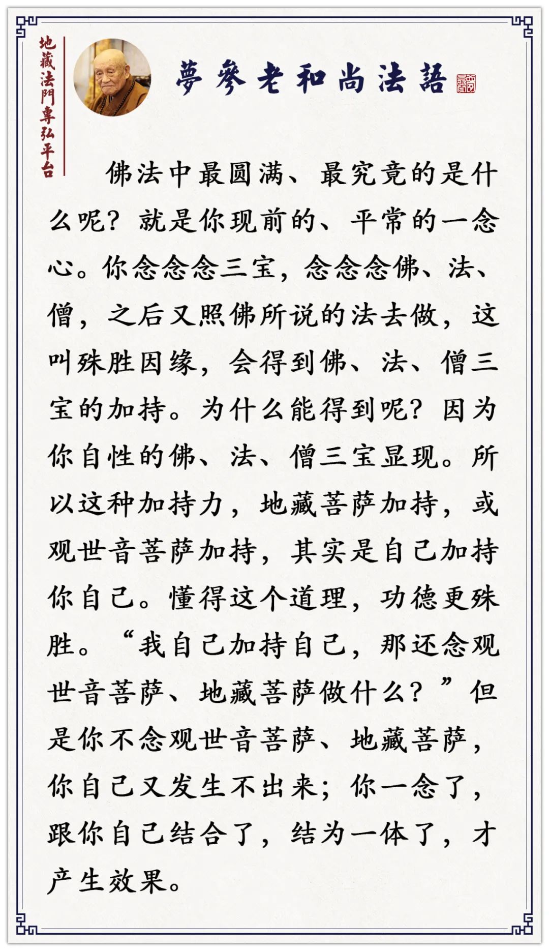 地藏菩萨告诉我们,“娑婆世界南阎浮提众生,起心动念都是造罪”,那你对照自己是不是这样子。“没有这样子,起心动念不是造罪,我一天缘念三宝力”,那就对了,说明你的灾难消除了很多。