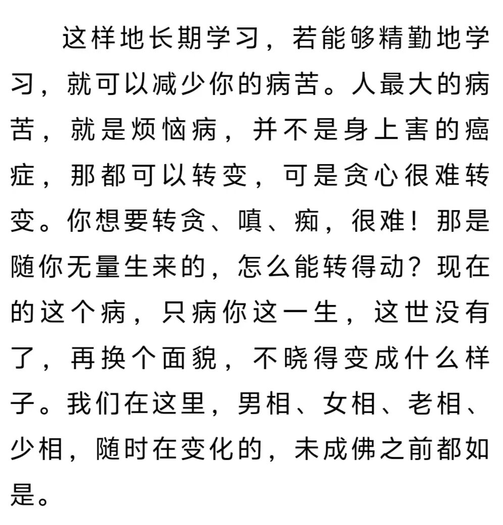 勇猛不是对待别人,而是对待自己的烦恼。自己对自己的贪嗔要勇猛一点。要是打败仗了,你的嗔心永远是愈发愈大,要勇猛地把它消除了、把它克制住了。要用什么力量?要忍耐。忍是很不容易的,在心上插把刀,你怎么忍受呀?往往我们的气来了,就忍受不了。古人说,气如下山的猛虎,当人一发脾气、嗔恨心来的时候,谁劝他也听不进去了,就得靠他自己的智慧制止。用忍耐力、用降伏力,莫发脾气。经常给人一个欢喜笑容,学一学弥勒菩萨的慈悲。你给人家哭,人家就还你一个哭。他骂你,你也对他笑;他打你,你也笑容对他,他就不好意思了,也打不下去。这就是嗔恨心。贪心也如是,贪、嗔、痴都差不多。要经常地观想忍辱,不跟任何人发脾气。一遇上违顺事,不顺心,或别人惹到我,自己马上就警觉了:这是我修行的好机会,这是我忏悔的好机会!如果经常这样想,你的贪、嗔、痴现前,能这样对治,还会愚痴吗?这就有智慧了。没有智慧是做不到的。练习对治自己的贪、嗔、痴,遇到这种境界现前,就克服了。佛答应给我们的妙药是什么呢?就是这些法。你就学佛的方法,学的时候,要精勤地学习。