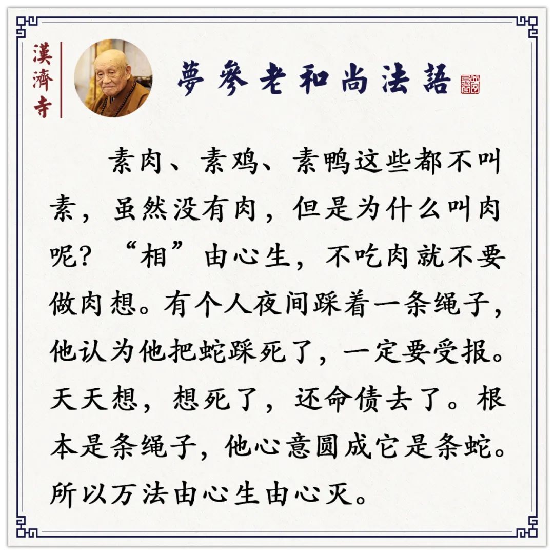 财、色、名、食、睡,你一定要设法对治。皈依三宝了,你还很爱财、很好色——色,有深有浅,穿的衣服要什么颜色的、什么样名牌的;总而言之,食,是包括一切食欲,吃的饮食要吃什么好饮食、要怎么样的。 虽然是现在吃素了,吃得很讲究,要吃这个那个的,还有什么素鸡、素鸭、素什么,全都上来了。现在这个素食铺,做得非常像形。我说你吃了,跟吃动物的身体是一样的罪,因为你心里在吃。为什么要这样做呢? 好多的事儿,引导你走上错误的道路。“我在吃素啊”。吃素又如何?人家吃肉但是没吃肉,没吃肉的反而看着人家在吃肉。像济公禅师吃狗肉,你看他吃狗肉,他没有吃狗肉啊。还有我们一个老和尚吃鹁鸽,他一天要吃一只鹁鸽。“你这个老和尚真造罪!”有一天他的徒弟把鹁鸽的一条腿拔了吃了。那师父怀疑:“这只鹁鸽怎么少一条腿啊?”他的徒弟说:“师父你天天吃啊,我吃条腿尝一尝嘛,不可以吗?”师父就没有多说什么,等一会儿,“我把骨头吐出来了。”这位师父也要求他的徒弟:“把腿吐出来,吐不出来你怎么吃呀?” 这虽然是个笑话,含义很深啊。我们既然是吃素,为什么要做素鱼、素虾?当然是有人愿点那个菜,素食馆才做。如果它的菜,每个弟子看了,从来不要这道菜,它就不会做了。 以前在北京有间功德林,还有香颐园,老板也是研究做素鱼、素虾。我说:“你研究了,你还不如拿荤的来吃,一样的嘛,素食还没有荤食营养,罪是一样的。何必呢?不要造那个业。”大家想想看,像形的素食有荤食的罪过、没有荤食的营养,这个问题可太大了。大家想想看,说只是像形,不是荤食,当时你心里做何感想?为什么要像形?懂得就行了。还有,现在很多的素食,添加许多致癌的东西,很不好消化。